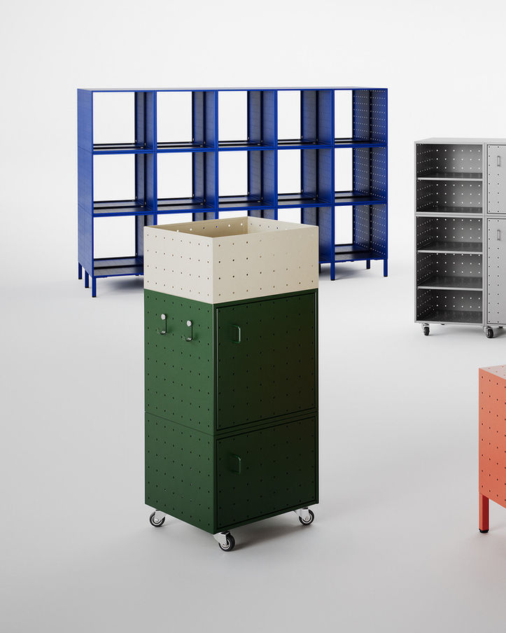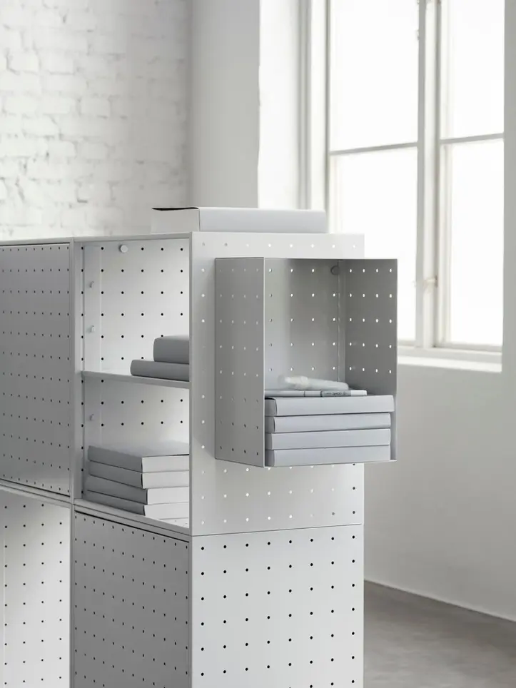 A modular storage system designed to adapt to how we work today. Built from perforated metal modules, Center Center can stack, connect, and reconfigure in multiple directions, turning storage into a flexible workspace infrastructure.