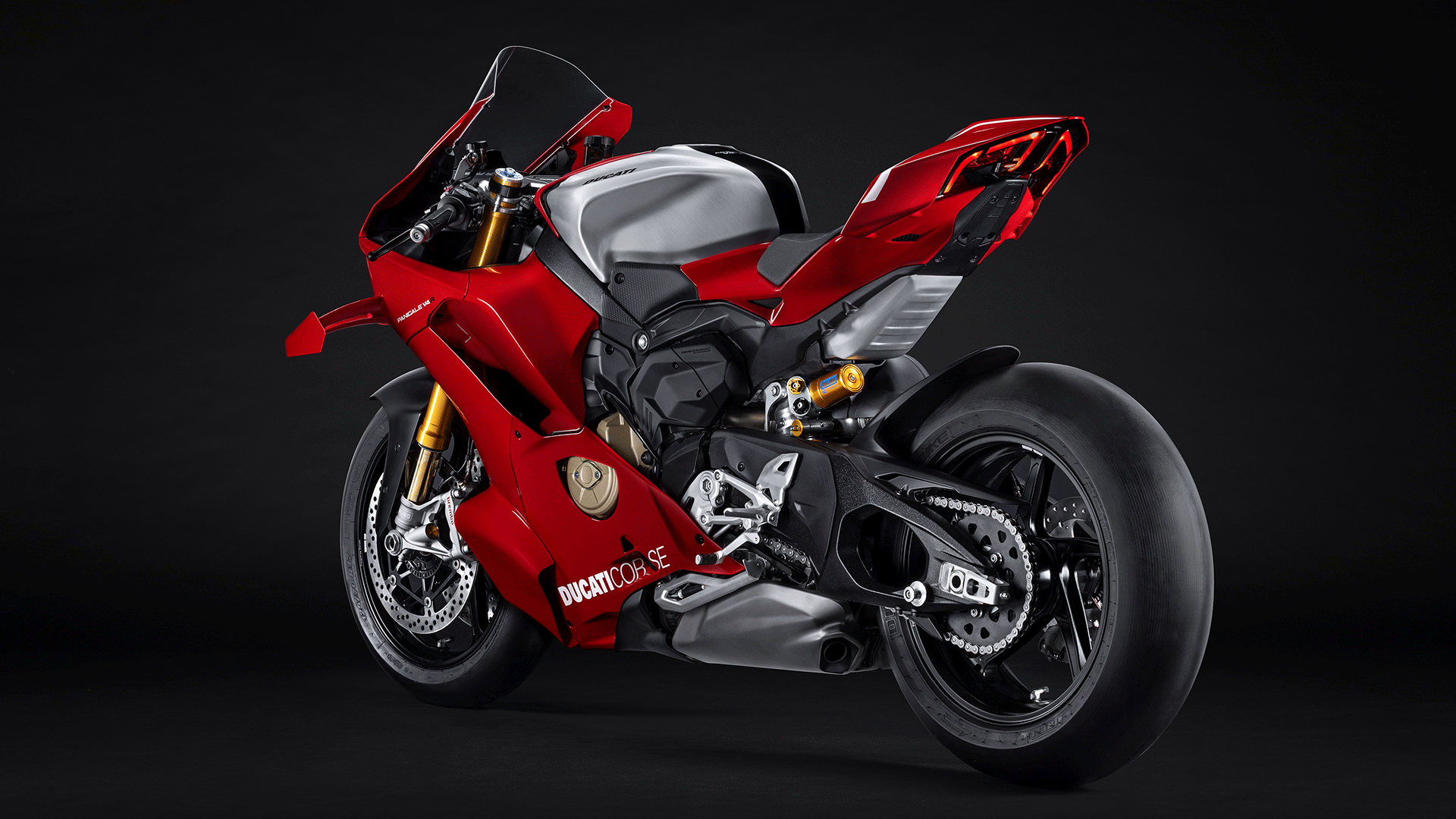 The Panigale V4 R introduces corner sidepods, a first on a production sports bike. These generate downforce when the motorcycle is leaned, stabilising the bike at high cornering speeds.