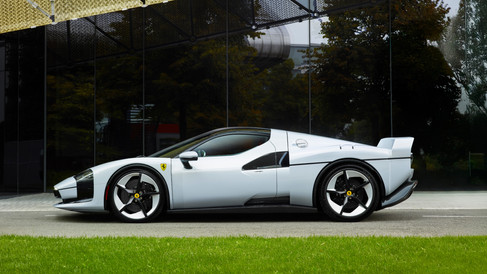 The SC40 White exterior tone, developed exclusively for this car, reflects a subtle connection between the exterior and the interior’s carbon-Kevlar. Small details like the brushed aluminium fuel and charging caps, the negative Ferrari lettering on the engine cover revealing the carbon below, and custom wheels with brushed and black-finished geometry complete the design narrative.