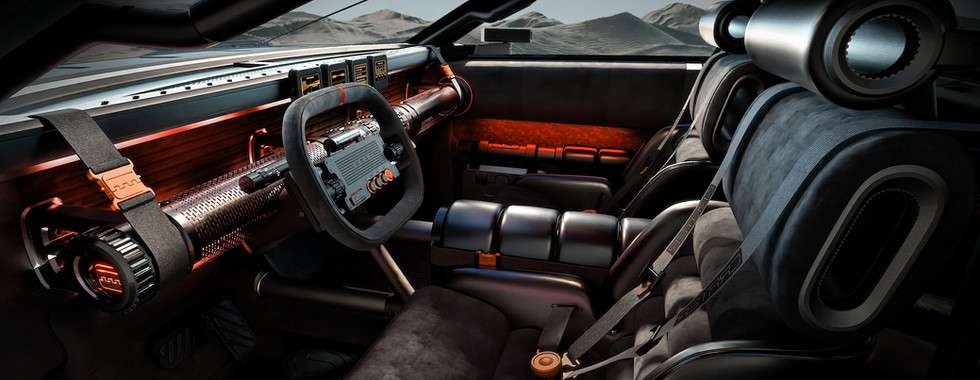 The exterior is finished in a green gold matte tone inspired by California sagebrush and canyon terrain. Small anodised orange highlights add contrast. Inside, the palette stays focused on black leather, Alcantara, brushed metal and textured patterns that echo topographic forms.