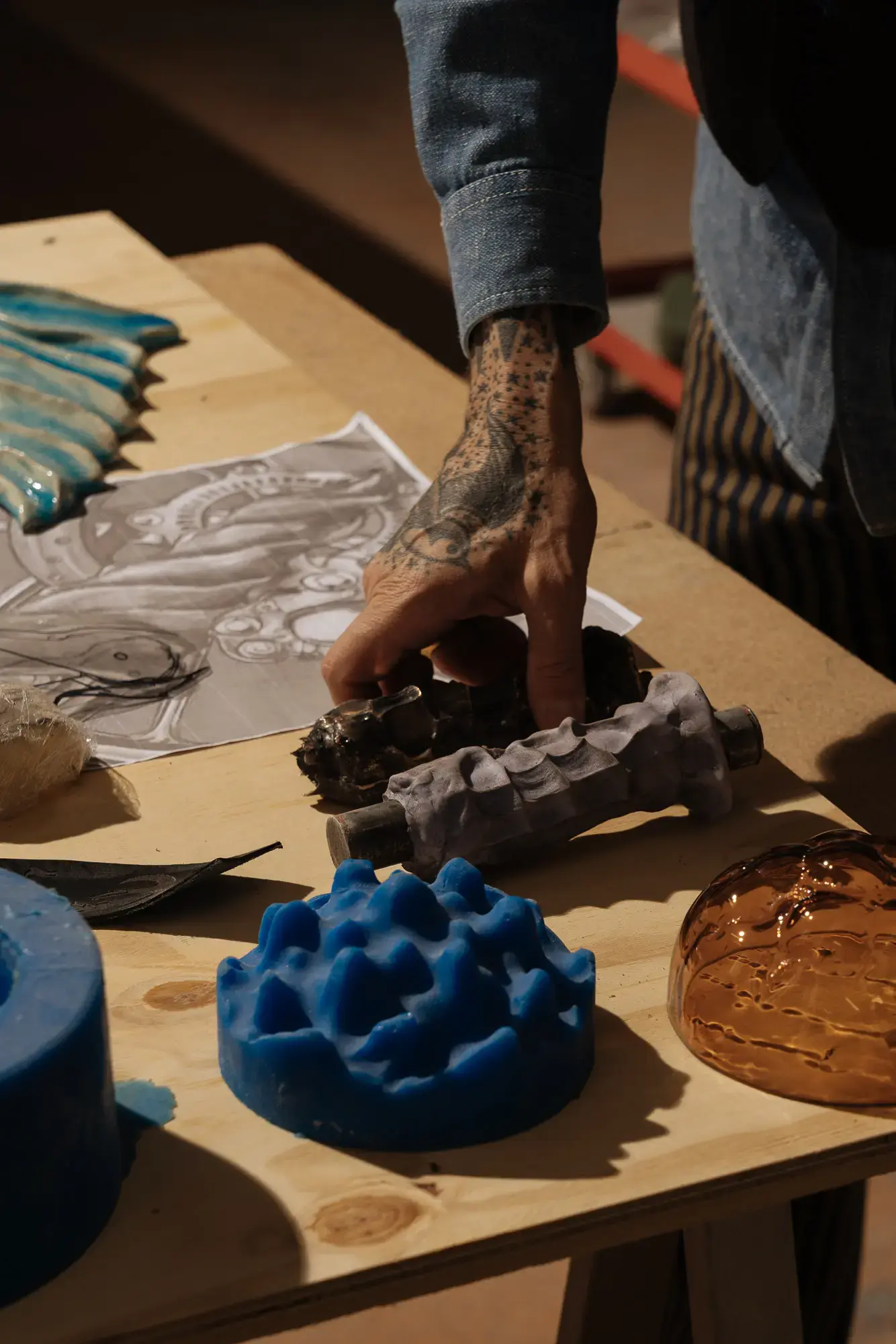 Materials | Travertine, bronze, walnut, resin, hand-blown glass |