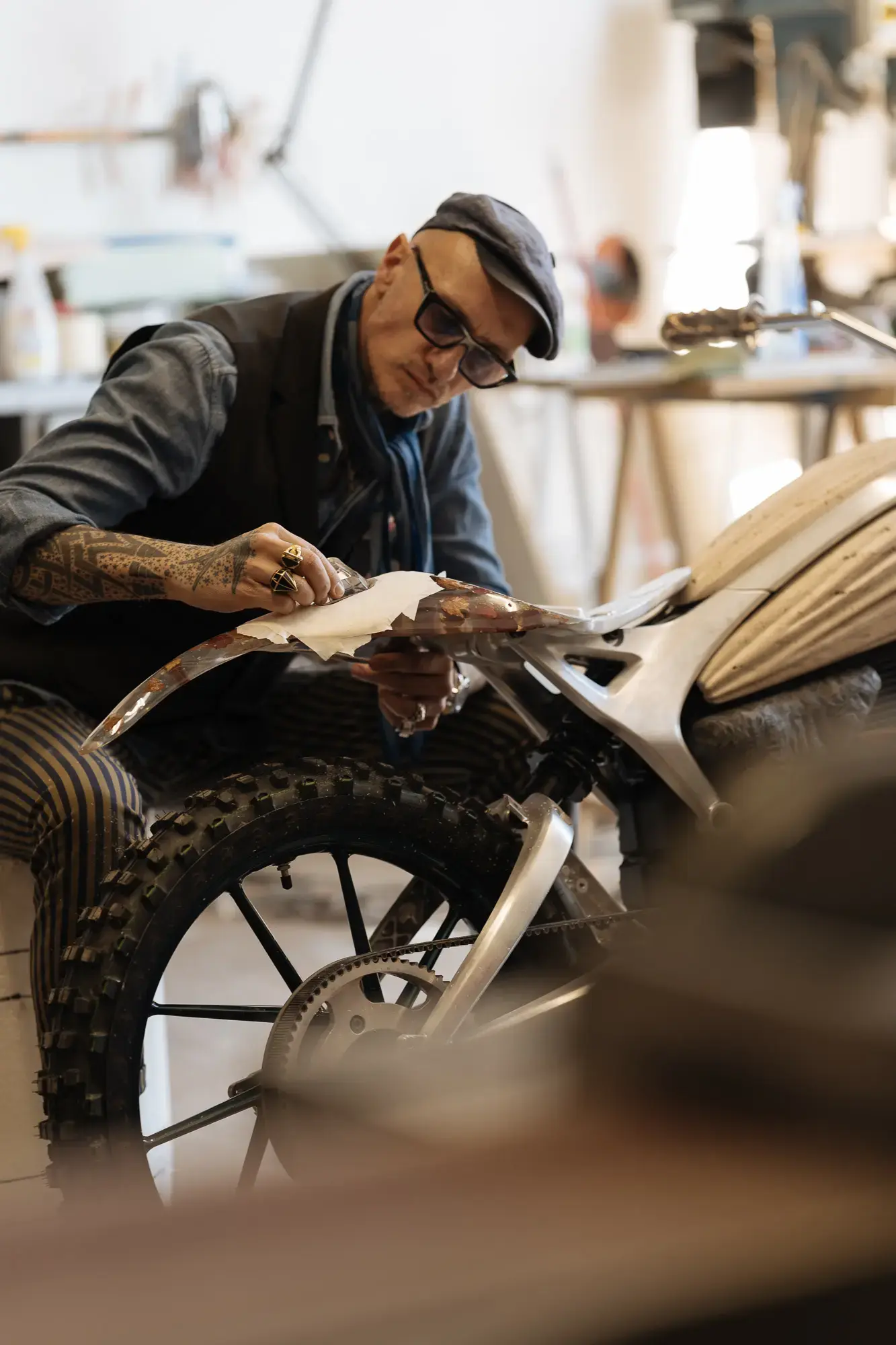 Biagi reinterpreted the FF.C6 using natural and symbolic materials, turning technical components into expressive surfaces. The fuel tank was carved from travertine, evoking the parachute heritage of the original wartime Flying Flea. Bronze handlebars and footpegs, marked with the artist’s fingerprints, introduced a human signature into the machine. Hand-blown glass replaced the lighting elements, offering fragility in contrast to the robust aluminium frame.